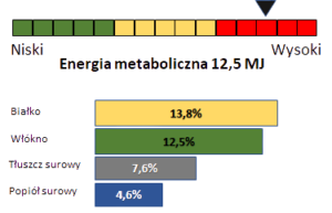 Składniki analityczne: Białko ogólne 13,8%, Włókno surowe 12,5%, Popiół surowy 7,00%, Tłuszcz surowy 7,6%, Skrobia 29,4%, Cukier 4,6%, Wapń 0,95%, Fosfor 0,37%, Magnez 0,18%, Sód 0,49%, Witamina A 13803j.m, Witamina D3 1691j.m, Witamina E 187,0j.m