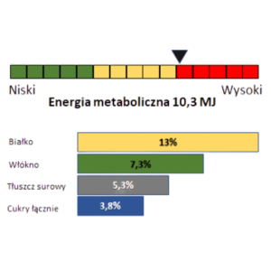 Białko ogólne 13%, Włókno surowe 7,3%, Popiół surowy 4,9%, Tłuszcz surowy 5,3%, Skrobia 26,7%, Cukry łącznie 3,8%, Wapń 1,3%, Fosfor 0,7%, Sód 0,5%, WitaminaA 22700j.m, WitaminaD3 4540j.m, WitaminaE 67,5j.m