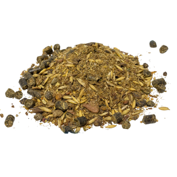 Skład: Lucerna granulowana, kiełki słodowe jęczmienne, owies gnieciony, śruta sojowa, wysłodki buraczane, siemię lniane, wytłok jabłkowy, olej lniany, proso, słonecznik nasiona, słonecznik łuska, drożdże piwne, MPU koń, tlenek magnezu, NaCl, mięta pieprzowa, babka lancetowata, szyszki chmielu, kozieradka, E672 Witamina A, E671 Witamina D3, E3a700 Witamina E